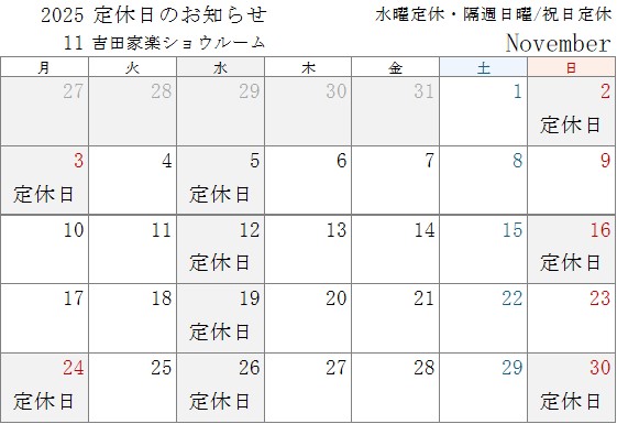 11月の定休日について