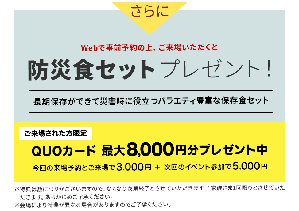 現地のご案内はご予約の方優先となります。Webからご予約いただいた上でご来場されますと、今なら様々な特典をプレゼント。ぜひ下記のボタンからご予約の上、ご来場ください。