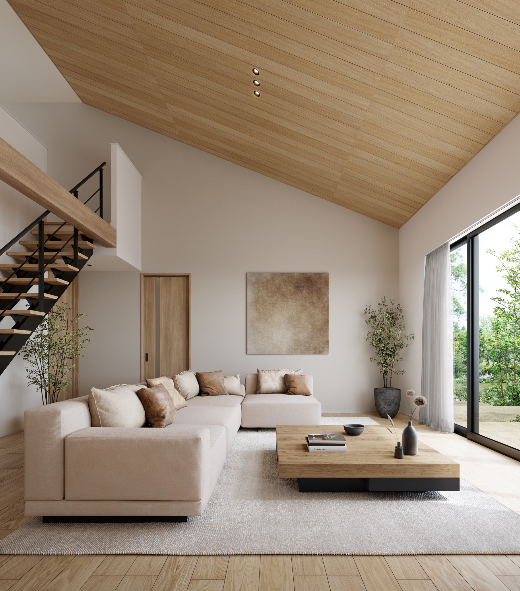 1.5階建てだからこそ叶えられる大屋根。ゆったりとした屋根面の下には、のびやかな吹き抜けとたっぷりと光を取り込む大開口の窓を。山梨の自然を堪能できる気持ちの良い空間設計が可能です。