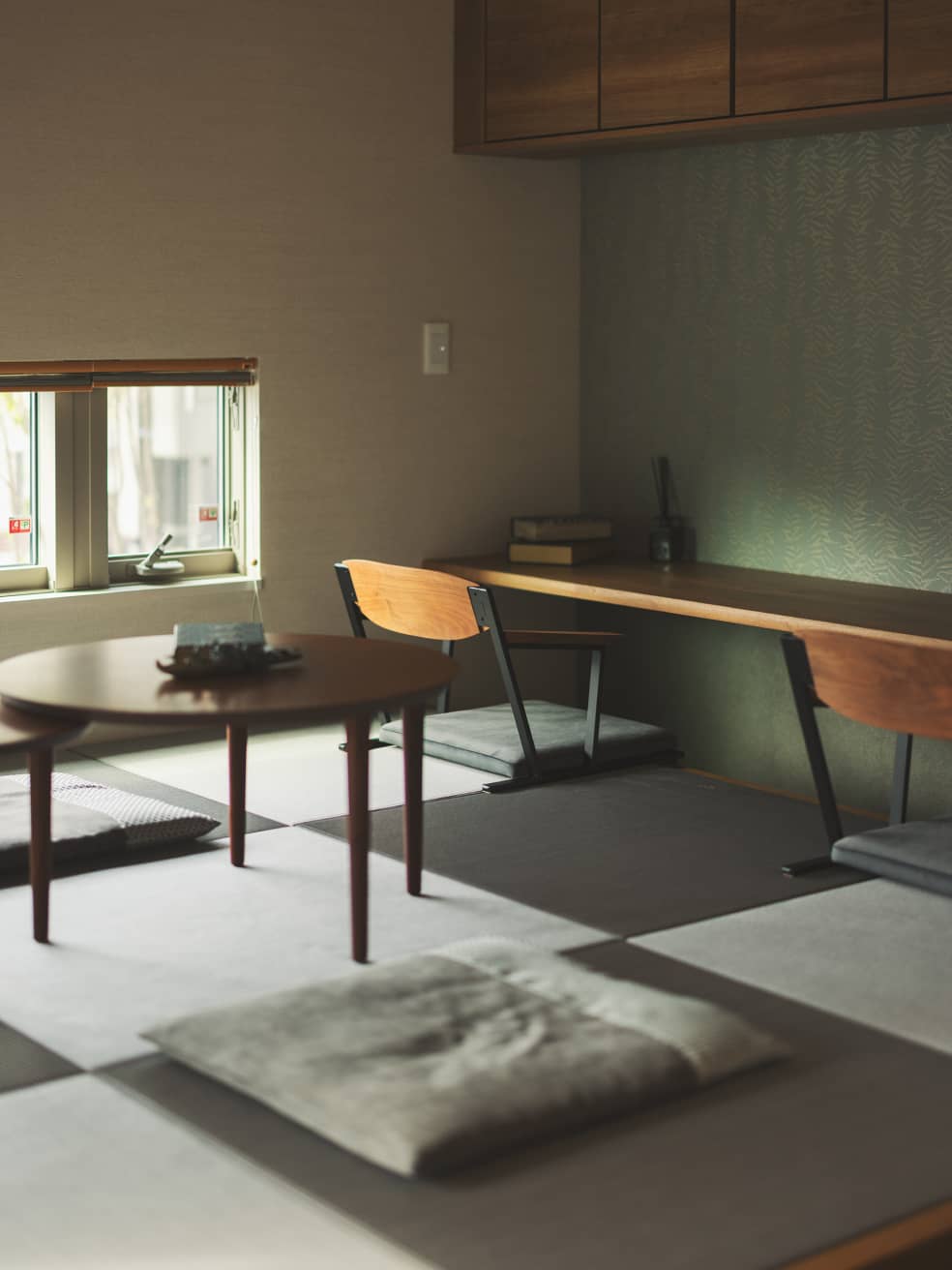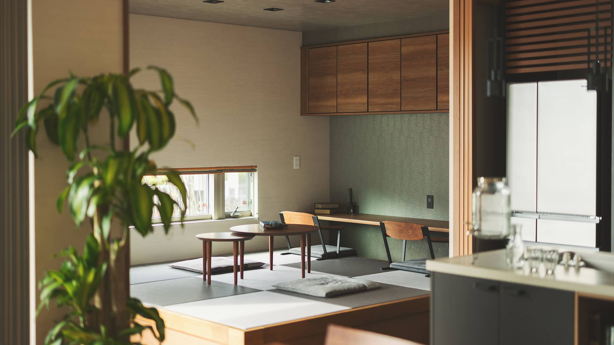 小さくても機能的。タタミコーナーは、ちょっと作業をしたいときの書斎として、子どもたちの遊び場・学習の場として大活躍。小上がりにすれば収納力もアップ&壁際のカウンター席は、足をおろして座ることができる。