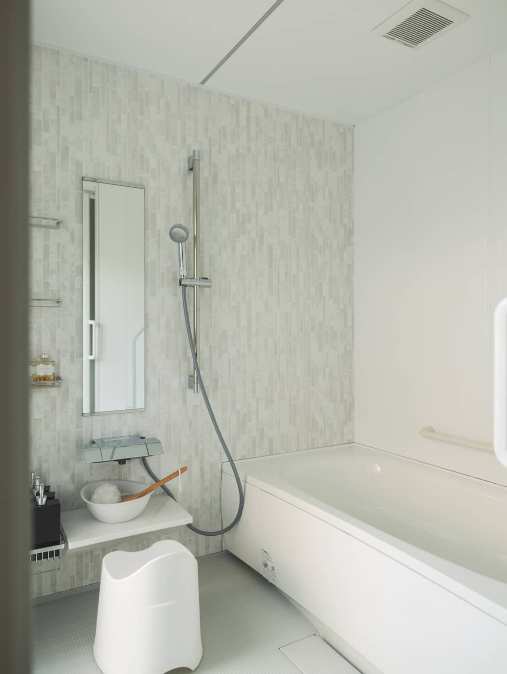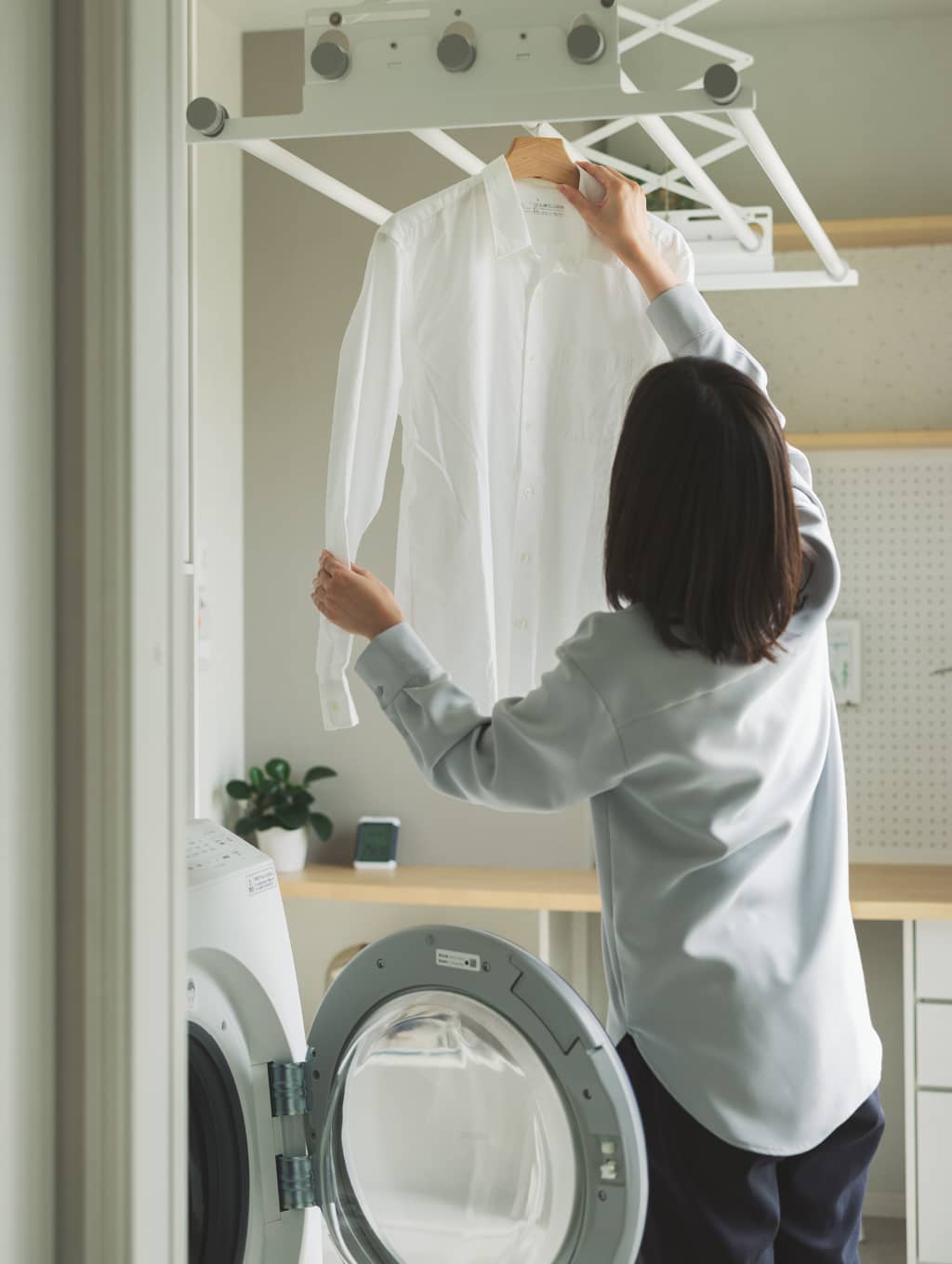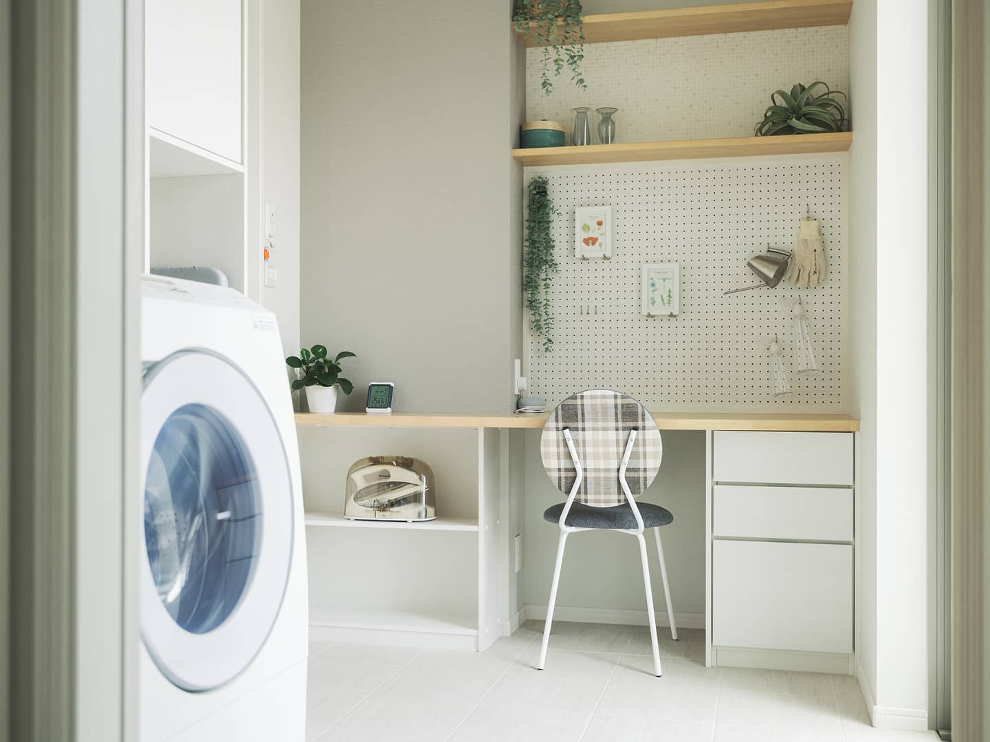 キッチンの隣には、洗濯・室内干し空間と、洗面・浴室を。ここは、毎日の家事を助けるバックヤード的空間だ。必要な収納、設備を揃えることはもちろん、キッチンから近いのも嬉しいポイント。