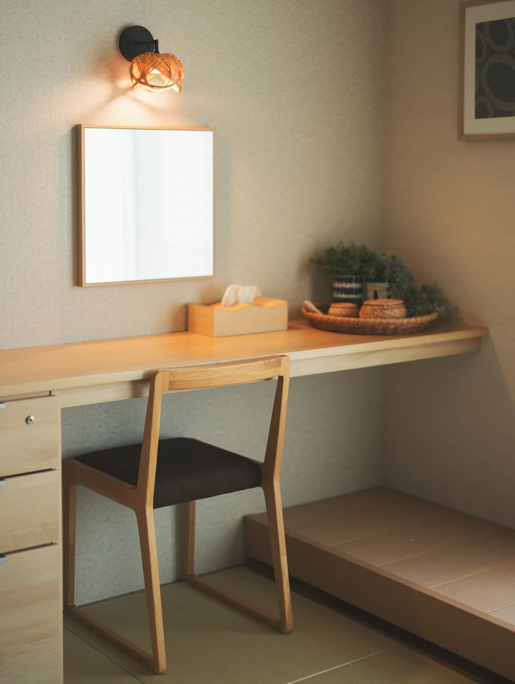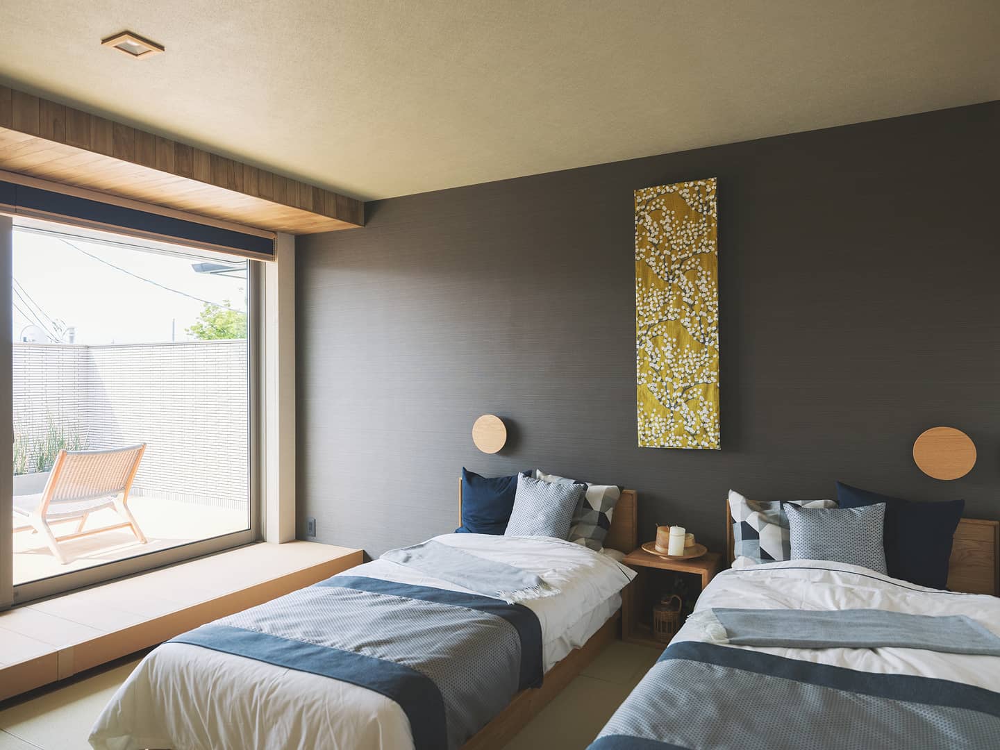 2階の寝室は、1階の共用空間と雰囲気を変えてみるのもいい。落ち着きのある上質なホテルライクにまとめた空間で、「エアロハス(全館空調)」がもたらしてくれる空気の気持ちよさを味わいながらぐっすり眠ろう。