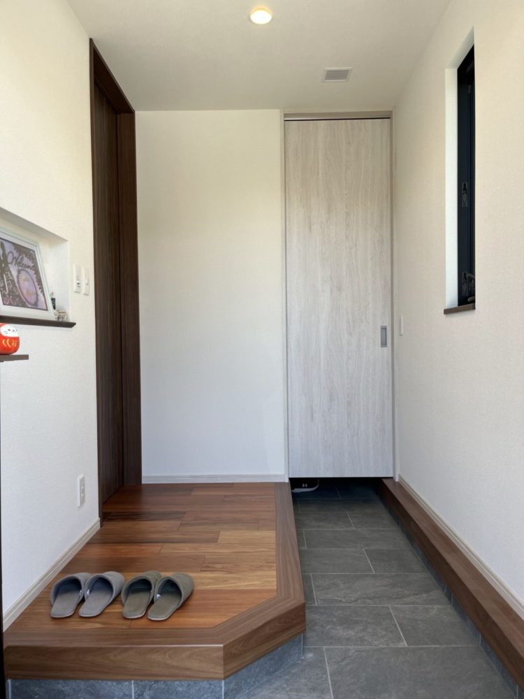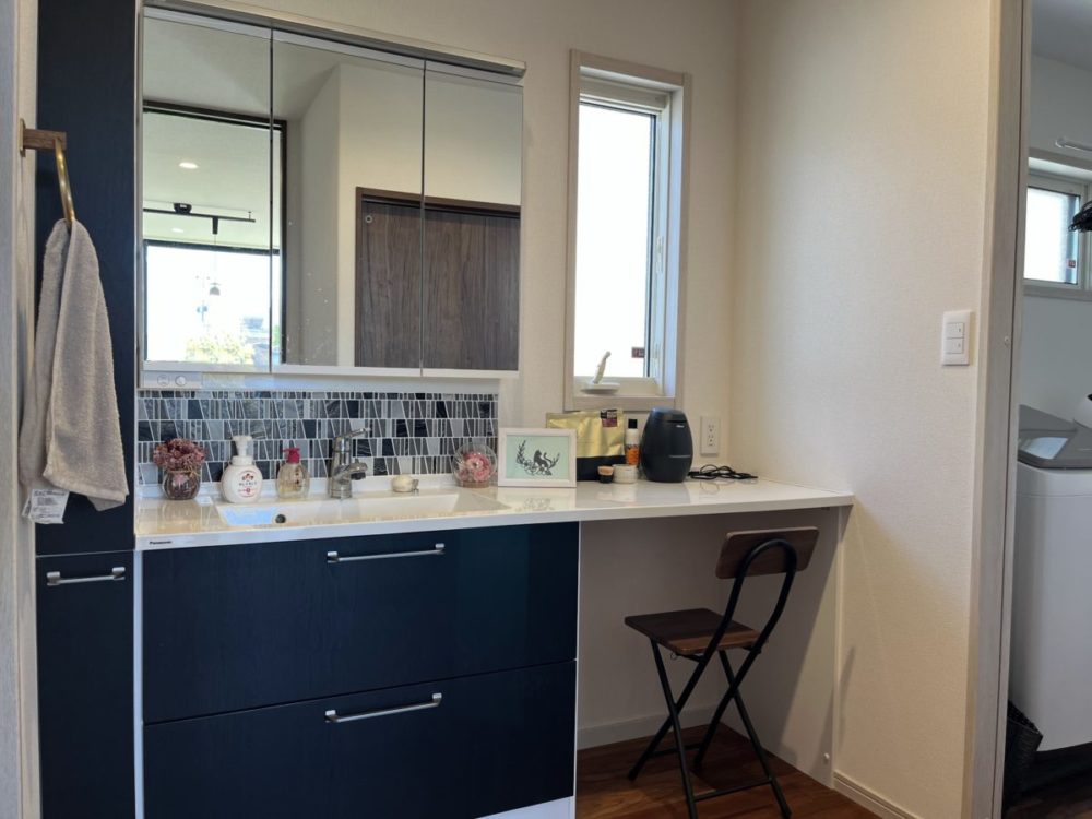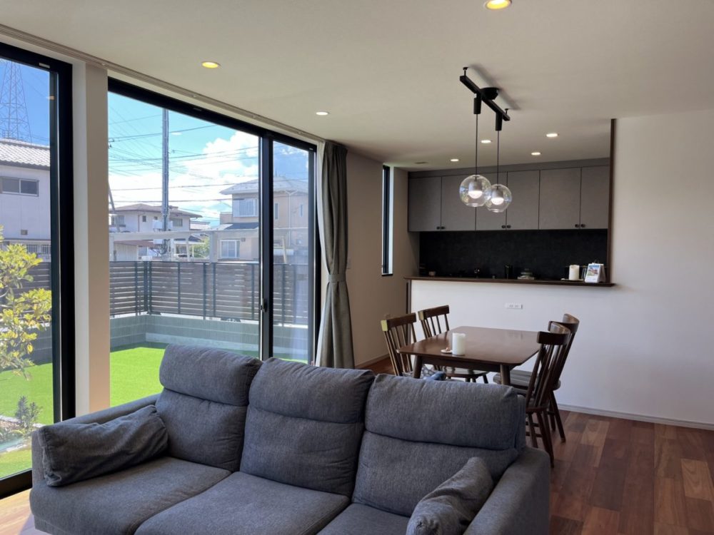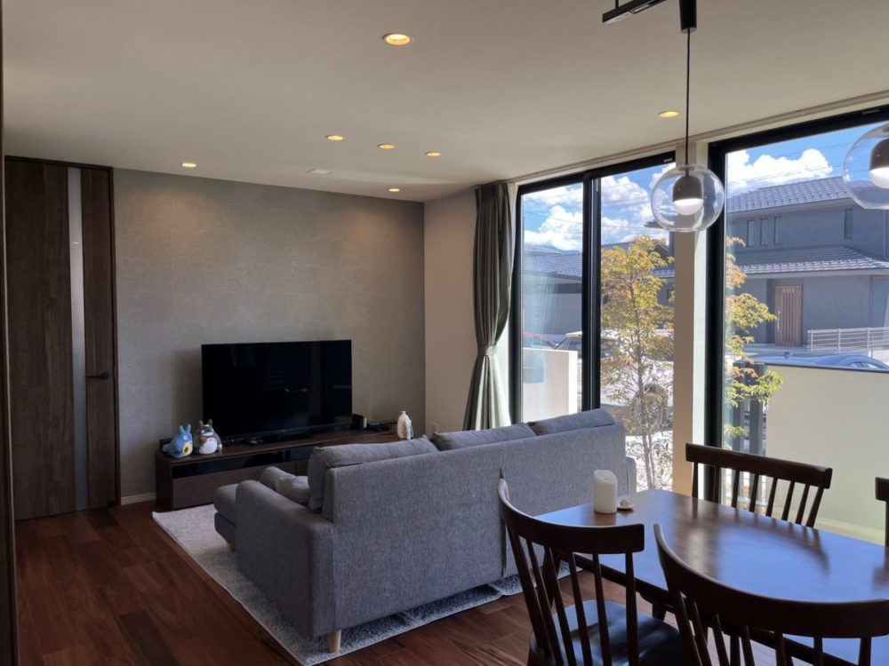 まもなく築2年となるH様のお宅にうかがいました。キラテックタイルはもちろん、家じゅうどこもきれいなままで、大切に住んでくださっていることがよくわかります。40度に迫る真夏の日中でしたが、全館空調エアロハスで室内は快適。シックなインテリアと、とても大きな掃き出し窓に映る明るい景色が心地よいコントラストでリビングを包みこみます。使い込んでいるはずのパントリーや洗面所も美しく、センスの良さがうかがえます。また、バルコニーをあえて付けていませんが、1階の物干しスペースとファミリークロークで洗濯と収納が完結する「家事楽」な住まい。家づくりのお手本にしたいお宅でした。